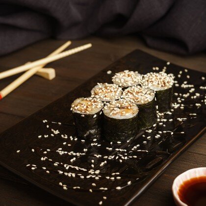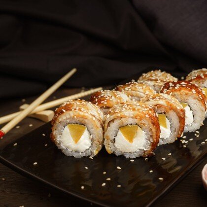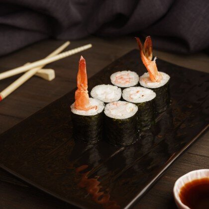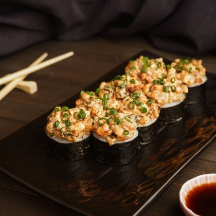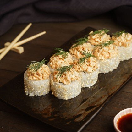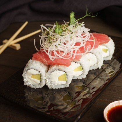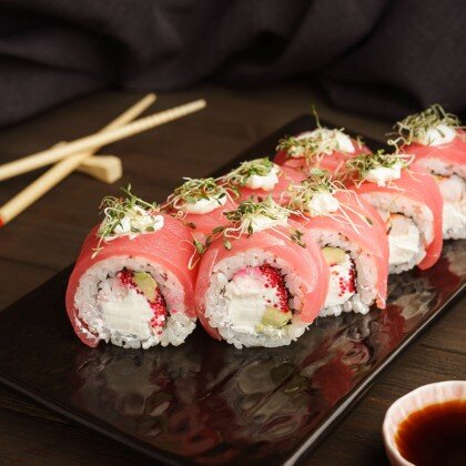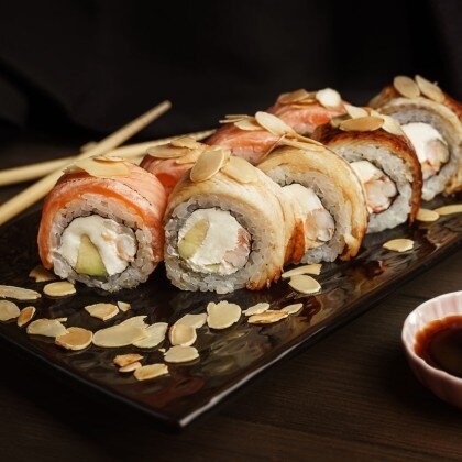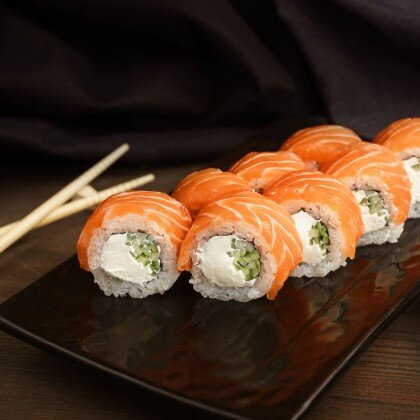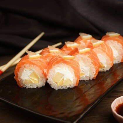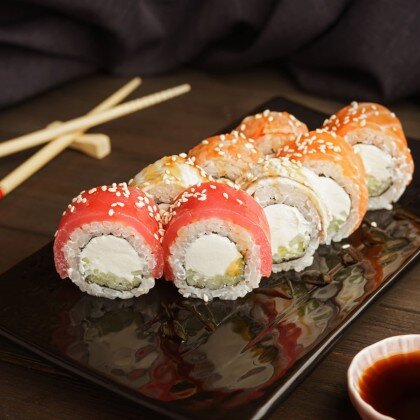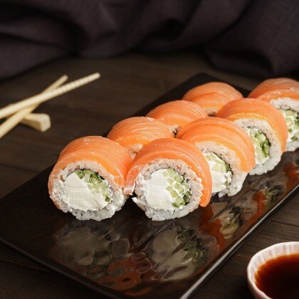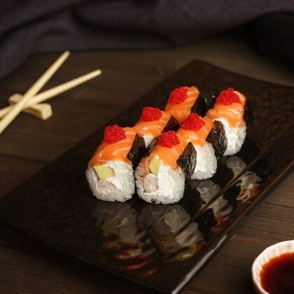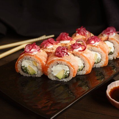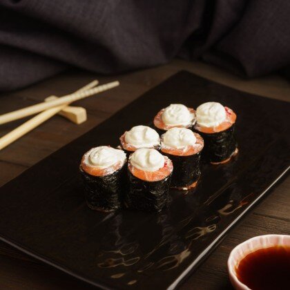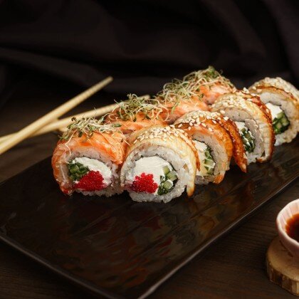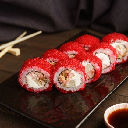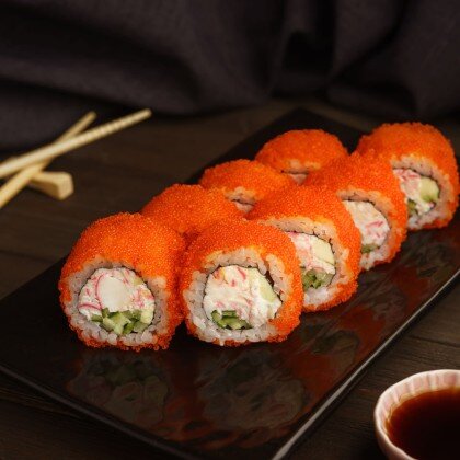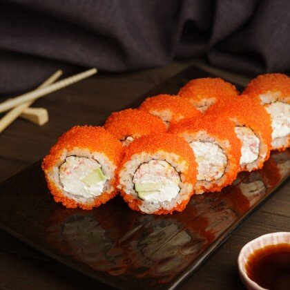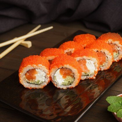 Фарерский лосось, икра тобико, сливочный сыр, креветки